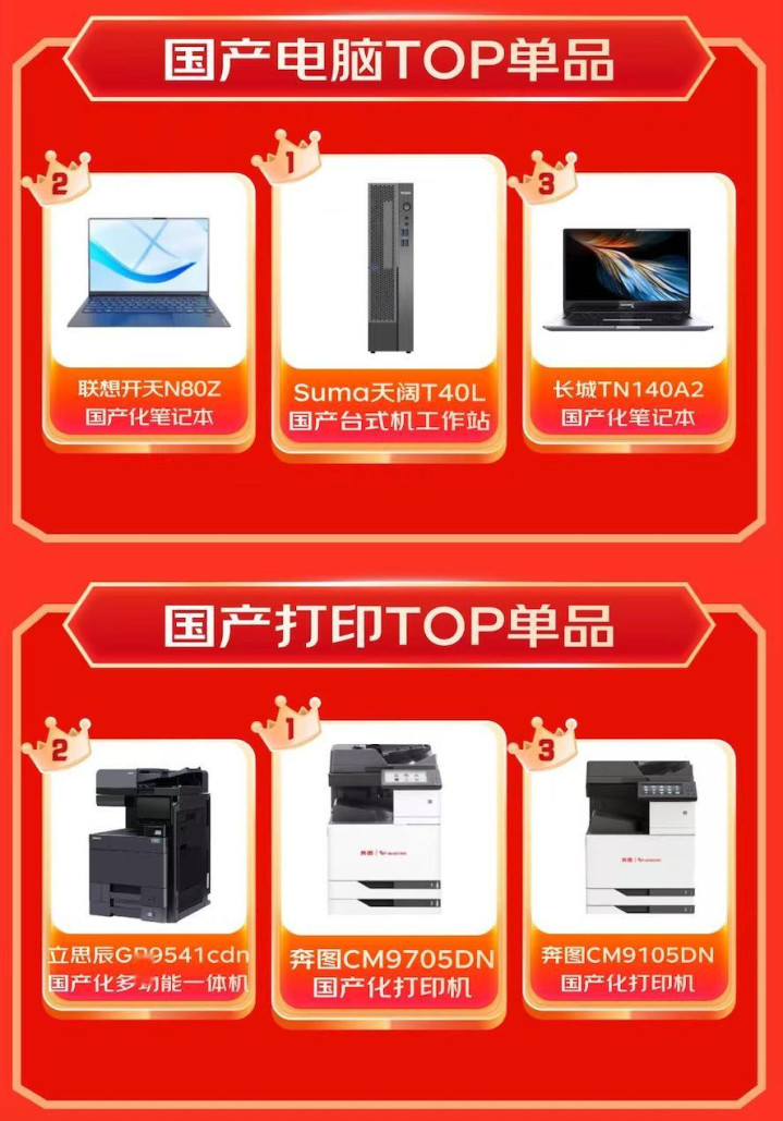 在国产设备领域,采购热点则进一步聚焦“实用可靠”。国产电脑品类中,联想开天N80Z、Suma天阔T40L与长城TN140A2位列成交前三;国产打印设备方面,立思辰GB9541cdn多功能一体机、奔图CM9705DN与奔图CM9105DN打印机凭借稳定性能与高性价比,成为政企采购的主要选择。