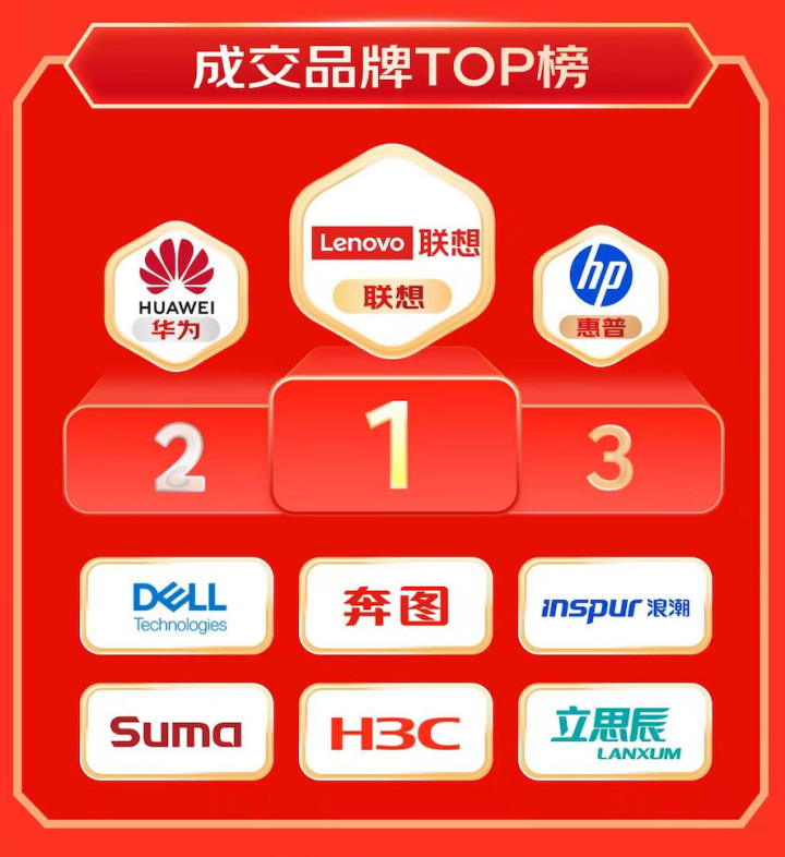 伴随企业采购需求的持续释放,品牌格局也进一步明晰。成交品牌TOP榜显示,联想、华为、惠普稳居前三,戴尔、奔图、浪潮、Suma、H3C、立思辰等国内外品牌也展现出强劲竞争力,共同构建起覆盖多层级、多场景的商用设备供给体系,为企业客户提供了更高效的设备选型与成本优化路径。