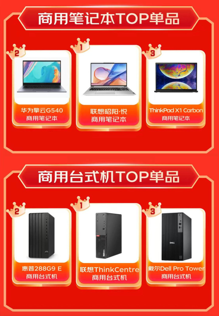 从热销单品排名来看,企业采购在商用整机领域展现出“高效办公”与“专业性能”并重的趋势。在商用笔记本品类中,联想昭阳·悦、华为擎云G540与ThinkPad X1 Carbon位列成交前三;商用台式机方面,联想ThinkCentre、惠普288G9 E与戴尔Dell Pro Tower成为最受关注的三款机型。