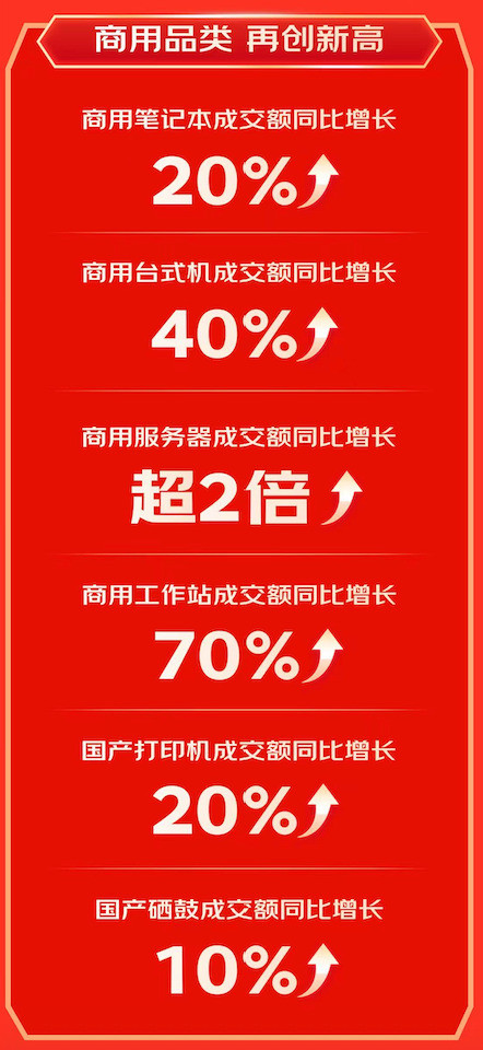 从细分品类来看,企业采购在基础办公与高性能设备两端同步发力。商用台式机成交额同比增长40%,商用笔记本增长20%,展现出企业对稳定、高效办公设备的持续投入;与此同时,商用服务器成交额增长超2倍,工作站品类也实现70%的提升,反映出政企客户在算力部署与专业场景应用方面的投入不断加大。在国产化领域,设备采购同样稳步推进,国产打印机成交额同比增长20%,国产硒鼓增长10%,显示出国内品牌在关键办公环节的渗透力与认可度持续增强。